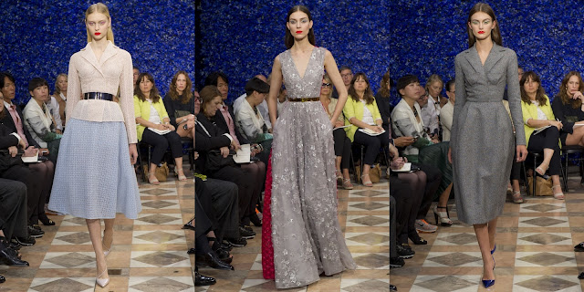 Feminine touches and old glamour, A-line shapes, belts bringing out the woman's shape, very classical and timeless. Daytime suits, for an ultra glamourous look and lovely textures, a true couture collection, recalling the timeless heritage of Christian Dior with defined accents from Raf Simons especially in the choice of birght colours ... blush pink, red, black, dark blue, yellow and white, with a focus on side pockets, lovely pointed court shoes and wool cigarette pants. He also featured Dior's wasp-waist New Look launched in 1947.